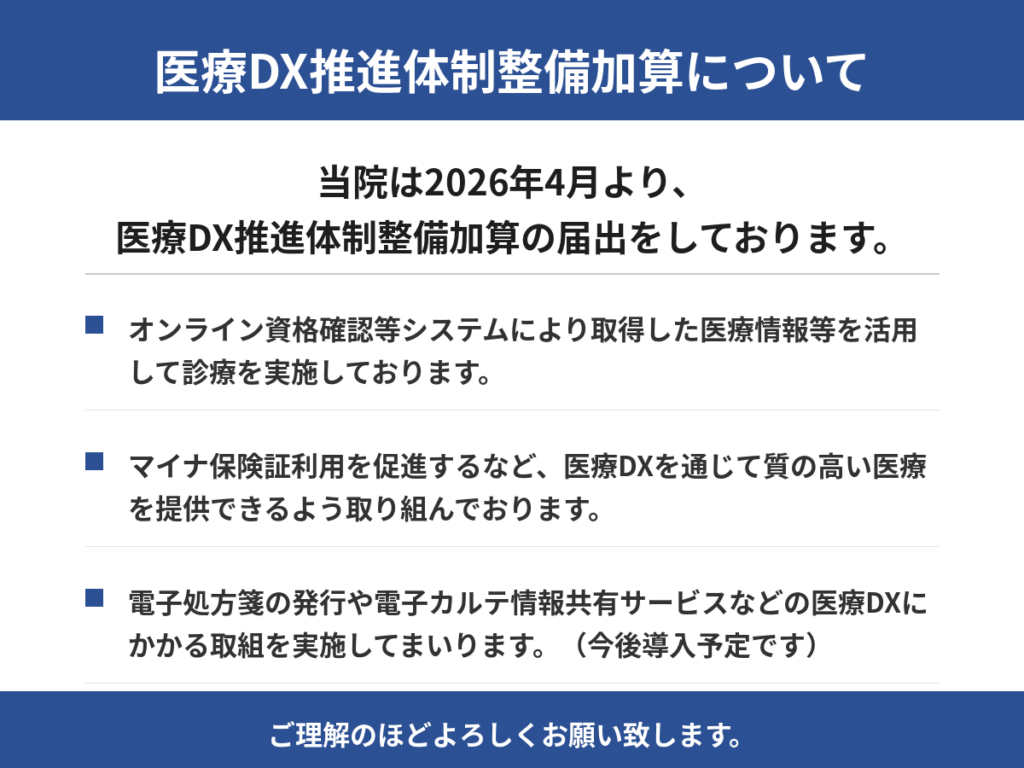 医療DX推進体制整備加算について2026.03.27 当院は2026年4月より、医療DX推進体制加算の届出をしております。下記よりご確認ください。 クリニック名称変更のお知らせ前の記事 時間外対応加算について次の記事